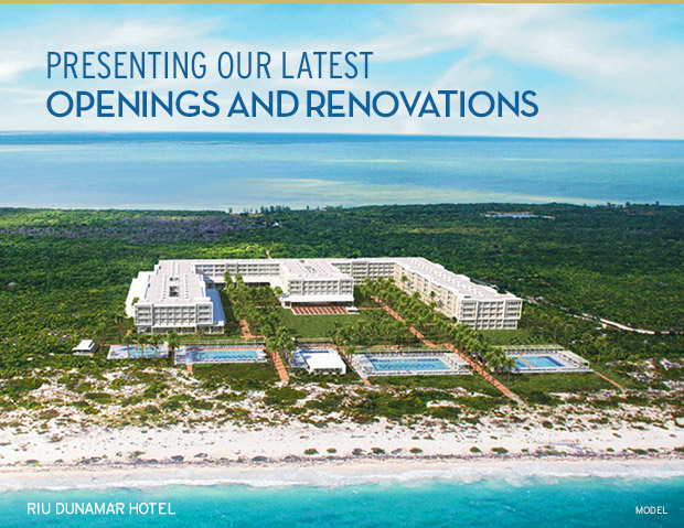 | We're pleased to present four beautiful All Inclusive hotels undergoing new construction, renovations or expansion this year. The exciting work is already underway on all the new facilities, amenities and features as we prepare to dazzle you and your clients with an endless variety of unforgettable stays. | |  | |  | Located within the Playa Mujeres development project across the bay from Isla Mujeres, our brand-new RIU DUNAMAR HOTEL is ideal for exploring the white-sand beaches and unique biodiversity of this world-class vacation destination. View more>> | | | | | Highlights from the renovations | • 740 guestrooms • 5 swimming pools • Free WiFi throughout the hotel | • Beachfront location • Restaurants, bars, nightclub and much more | |  | |  | Completely renovated when it reopens October 28th of this year as ADULTS ONLY, this resort will offer special ADDED VALUES ideal for adults who enjoy tranquil stays surrounded by the exclusive services and facilities of our sophisticated Palace line. View more>> | | | | | Renovations will include: | • 360° front desk • New pool with swim-up bar • New Indian restaurant | • New Gym • New 24 hr lounge • New Cappuccino Café |  | |  | Nestled within our five-hotel Punta Cana complex, this completely renovated hotel will reopen July 15th of this year with free access to SPLASH WATER WORLD, three new restaurants and a variety of new facilities and amenities, including: View more>> | | | | • Completely renovated common areas • New deluxe rooms • New restaurants: "Kulinarium", "Steakhouse", "Spanish Specialties" | • New pool with swim-up bar • New sun terrace and sunloungers • New RIU4YOU Teens´ Club • New gym, and much more |  | |  | We are pleased to announce the expansion of Riu Republica Hotel with the opening of its brand-new wing set for Winter 2017/18. This hotel just recently opened and is already thrilling guests with its modern design, tranquil ADULTS ONLY ambiance, special ADDED VALUES and alluring oceanfront views overlooking Arena Gorda Beach. View more>> | | | | | • 507 NEW guestrooms • Main restaurant • Indian restaurant • "Olé" Spanish restaurant, "Kulinarium" restaurant "Jerk" grill on the beach • Irish pub | • "Coco's Bar" on the beach • Aquatic bar • Poolside bar with plaza and stage • 3 swimming pools • Splash Water World with 4 toboggans (separate from the one in our Punta Cana complex) | About RIU Hotels & Resorts RIU Hotels & Resorts is one of the largest hotel chains in the world, with more than 100 hotels in 21 countries and a workforce of over 22,000 employees. The characteristic that makes RIU stand out is the exclusive service it offers its guests so they always feel completely satisfied. WORLD-FAMOUS ALL INCLUSIVE BEACH RESORTS CANCUN • RIVIERA MAYA • RIVIERA NAYARIT • CABO SAN LUCAS • MAZATLAN • PUNTA CANA PUERTO PLATA • BAHAMAS-PARADISE ISLAND • MONTEGO BAY • NEGRIL • OCHO RIOS • ARUBA COSTA RICA • PANAMA • SAINT MARTIN  | | © 2017, RIU Hotels & Resorts • All Rights Reserved. | | RIU,riu.com, Riu Class, Riu Plaza and the RIU logo are registered trademarks of Riu Hotels, S. A. in Spain and other countries. Images may be protected by intellectual property and copyright. Other names of companies, products and services may be the registered trademarks of third parties. All rights reserved. © Copyright Riu Hotels, S. A. 2017. | | | | | | Northstar Travel Group 100 Lighting Way, 2nd Floor Secaucus, NJ 07094 | | | |