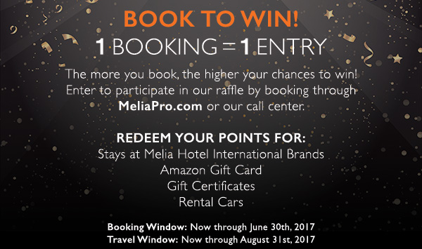 T&C: Travel agents must have an active MELIÁ PRO Rewards loyalty card to participate, which must be activated after logging on www.meliapro.com. Contest combinable with other promotions available for MELIÁ PRO. Valid for bookings made through MELIÁ PRO and the call center only. Winner will be chosen during the first two weeks of September. Valid for travel agents located in The Americas, except for Brazil and Cuba. Prize is not transferable. Entrants agree to be bound by these Rules and by the decisions of the Sponsor, which are final and binding in all | Prize may not be substituted or exchanged and is not redeemable for cash. All federal, state, and local taxes associated with the receipt or use of any prize awarded are the sole responsibility of the winner. By entering this Promotion, you release the Sponsor and Sponsor's directors, officers, employees, consultants and other representatives or agents from any liability whatsoever, and waive any and all causes of action related to any claims, costs, injuries, losses, or damages of any kind arising out of or in connection with the Promotion or delivery, misdelivery, acceptance, possession, use or inability to use any prize (including, but not limited to, claims, costs, injuries, losses, and damages related to personal injuries, death, damage to or destruction of property, or rights of publicity or privacy), whether under a theory of contract, tort, warranty or any other theory.