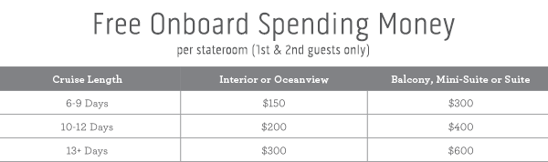 CANADIAN RESIDENTS: Fares are shown in U.S. Dollars, and also available in Canadian dollars. Ask your travel agent or call Princess for details. ‡FREE Onboard Spending Money of up to $600 per stateroom is based on voyage length and stateroom type. Offer is applicable to first two guests in a stateroom. Offer is applicable to first two guests in a stateroom. Guests with single occupancy will receive double the per guest credit amount. Offer does not apply to third or fourth guests. Spending money may be used on a single voyage only, is not redeemable for cash, cannot be used in the casino, expires at the end of that voyage and is not applicable during the land portion of cruisetours. Onboard spending money is based on the ship’s onboard currency.
