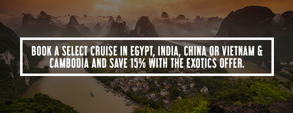Or travel somewhere exotic and save 15% on select cruises with our Exotics Offer or $2,500 on select departures of India's Golden Triangle & the Sacred Ganges with the Inspirational India Sale.