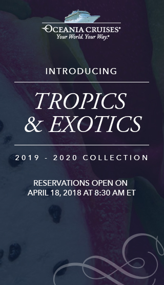 Oceania Cruises S. de R.L. 7665 Corporate Center Drive, Miami, FL 33126 *Offers and fares are subject to change on 10/1/18. Visit OceaniaCruises.com for current pricing. All fares are per person in U.S. dollars, valid for residents of United States and Canada, based on double occupancy (unless otherwise noted), for new bookings only and may be withdrawn at any time. 50% Off Deposits apply to voyages that are not within final payment. Free Internet amenity does not include streaming and includes one log-in per stateroom, except Owner's, Vista & Oceania Suites, which receive two log-ins per suite. Visit OceaniaCruises.com/Internet for more details. OLife Choice amenities are per stateroom, based on double occupancy and subject to change. OLife Choice free shore excursions vary by voyage and exclude Oceania Select, Oceania Exclusive, Executive Collection, Food & Wine Trails, Wellness and Culinary Discovery Tours. Voyages up to 9 days receive 4 free shore excursions; 10-13 days receive 6 free shore excursions; 14+ days receive 8 free shore excursions. If shore excursion amenity is selected, all excursions must be chosen at least 14 days prior to sailing. OLife Choice beverage package amenity is House Select. Guests in the same stateroom must choose the same OLife Choice amenity and amenity must be chosen by final payment. Not all promotions are combinable. 2 for 1, Cruise-Only and OLife Choice Fares are based on published Full Brochure Fares; such fares may not have resulted in actual sales in all suite and stateroom categories and do not include optional charges as detailed in the Guest Ticket Contract, which may be viewed, along with additional terms, at OceaniaCruises.com. Cruise-Only Fares do not include OLife Choice amenities or airfare. All Fares include government fees & taxes. Air Upgrade, if applicable, is a Premium Economy Air Upgrade only available when air is purchased through Oceania Cruises. It applies to intercontinental flights only and is priced per person, each way, on select voyages from select gateways, open to all categories for European embark and/or disembark ports only and based on availability. Not all amenities will be available on all carriers. "Airfare" does not include ground transfers and offer applies to coach, round trip flights only from the following airports: ATL, BOS, CLT, DCA, DEN, DFW, DTW, EWR, IAH, IAD, JFK, LAX, LGA, MCO, MDW, MIA, ORD, PHL, PHX, SAN, SAV, SEA, SFO, TPA, YOW, YUL, YVR, YYZ. Oceania Cruises reserves the right to assign gateways based on availability for JFK, LGA and MIA. Gateways are subject to change at any time. Airfare is available from all other U.S. and Canadian gateways for an additional charge. "Airfare" includes all airline fees, surcharges and government taxes. Airline-imposed personal charges such as baggage fees may apply. Oceania Cruises voyages calling on Cuba fully comply with the existing U.S. Federal Regulations and the most recent pronouncements from the Office of Foreign Assets Control ("OFAC") of the U.S. Department of the Treasury. Please see our website for additional visa and documentation requirements. Cuba ports of call are subject to confirmation. Additional terms and conditions apply for Around the World 2020 voyages, please visit OceaniaCruises.com/terms. Oceania Cruises reserves the right to correct errors or omissions and to change any and all fares, fees, promotions and surcharges at any time. Ships' Registry: Marshall Islands. |