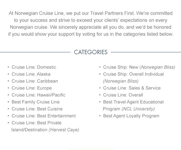 We hope you enjoyed this email from: Norwegian Cruise Line | 7665 Corporate Center Drive | Miami, Florida 33126 | 800.327.7030 ©2016 NCL Corporation LTD. Ship's Registry: Bahamas and United States of America. PLEASE DO NOT REPLY TO THIS MESSAGE All replies are automatically deleted. If you have specific questions or feedback, please contact your Business Development Manager. TA_TWV110818 / 38501 |